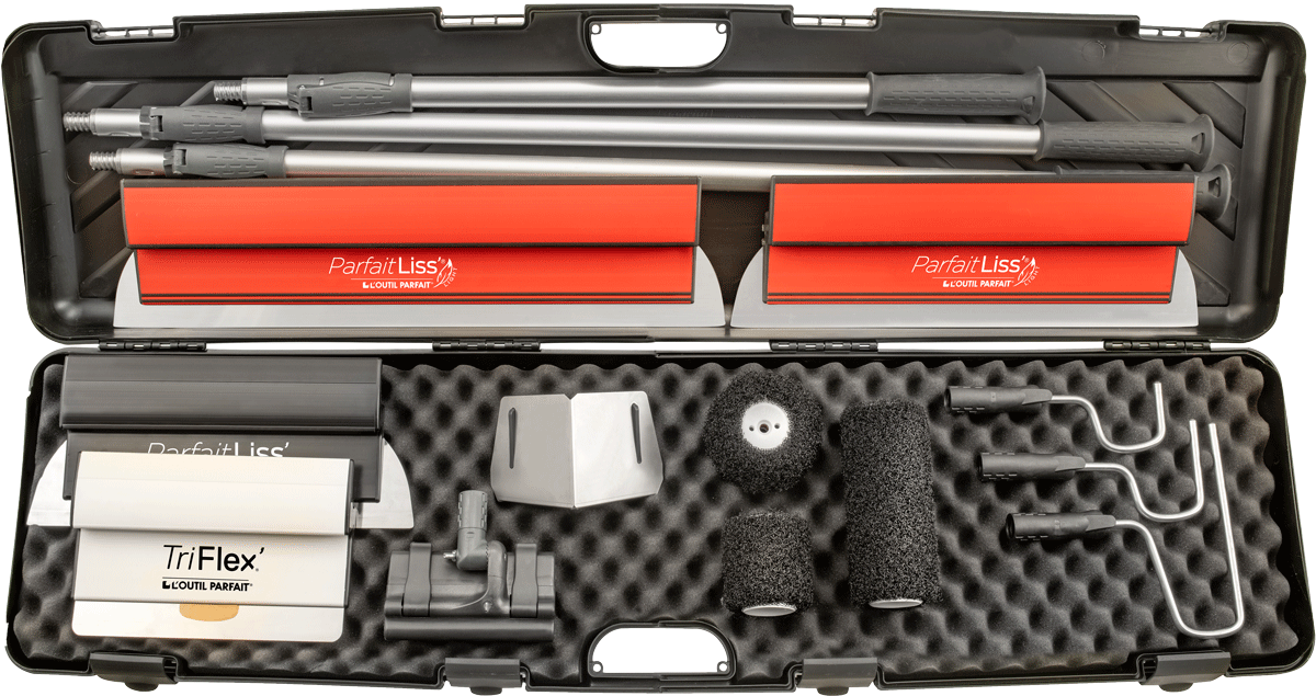 - 15-piece kit : 2 ParfaitLiss'® Light 45 and 60 cm - 1 ParfaitLiss''® Rigid 35 cm - 1 TriFlex'® clamping knife - 2 OP Process'® pole 2x1 m - 1 OP Process'® pole 2x0.7 m - 5 OP Process'® connectors : 1 ParfaitLiss'® + 1 Corner trowel + 3 Frames (40, 80 and 180 mm) - 3 Roll'Enduit® rollers refills (corner, 80 and 180 mm) - Case : 117x30x12 cm